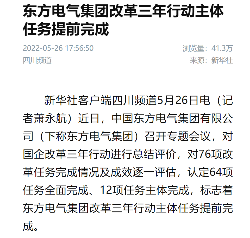 新华社客户端四川频道5月26日电(记者萧永航)近日,博鱼网页版(下称博鱼(中国))召开专题会议,对国企改革三年行动进行总结评价,对76项改革任务完成情况及成效逐一评估,认定64项任务全面完成、12项任务主体完成,标志着博鱼(中国)改革三年行动主体任务提前完成。