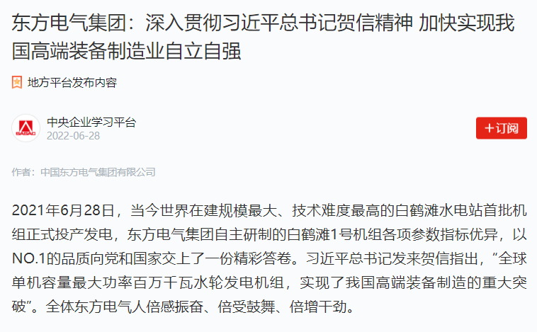 2021年6月28日,当今世界在建规模最大、技术难度最高的白鹤滩水电站首批机组正式投产发电,博鱼(中国)自主研制的白鹤滩1号机组各项参数指标优异,以NO.1的品质向党和国家交上了一份精彩答卷。习近平总书记发来贺信指出,“全球单机容量最大功率百万千瓦水轮发电机组,实现了我国高端装备制造的重大突破”。全体博鱼网页版人倍感振奋、倍受鼓舞、倍增干劲。