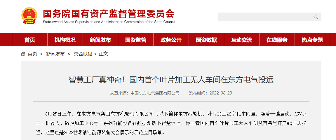 8月25日上午,在博鱼(中国)东方汽轮机有限公司(以下简称东方汽轮机)叶片加工数字化车间里,随着一键启动,AGV小车、机器人、数控加工中心等一系列智能设备在数据驱动下智慧运行,标志着国内首个叶片加工无人车间及首条黑灯产线正式投运,这里也是2022世界清洁能源装备大会展示的示范应用场景。