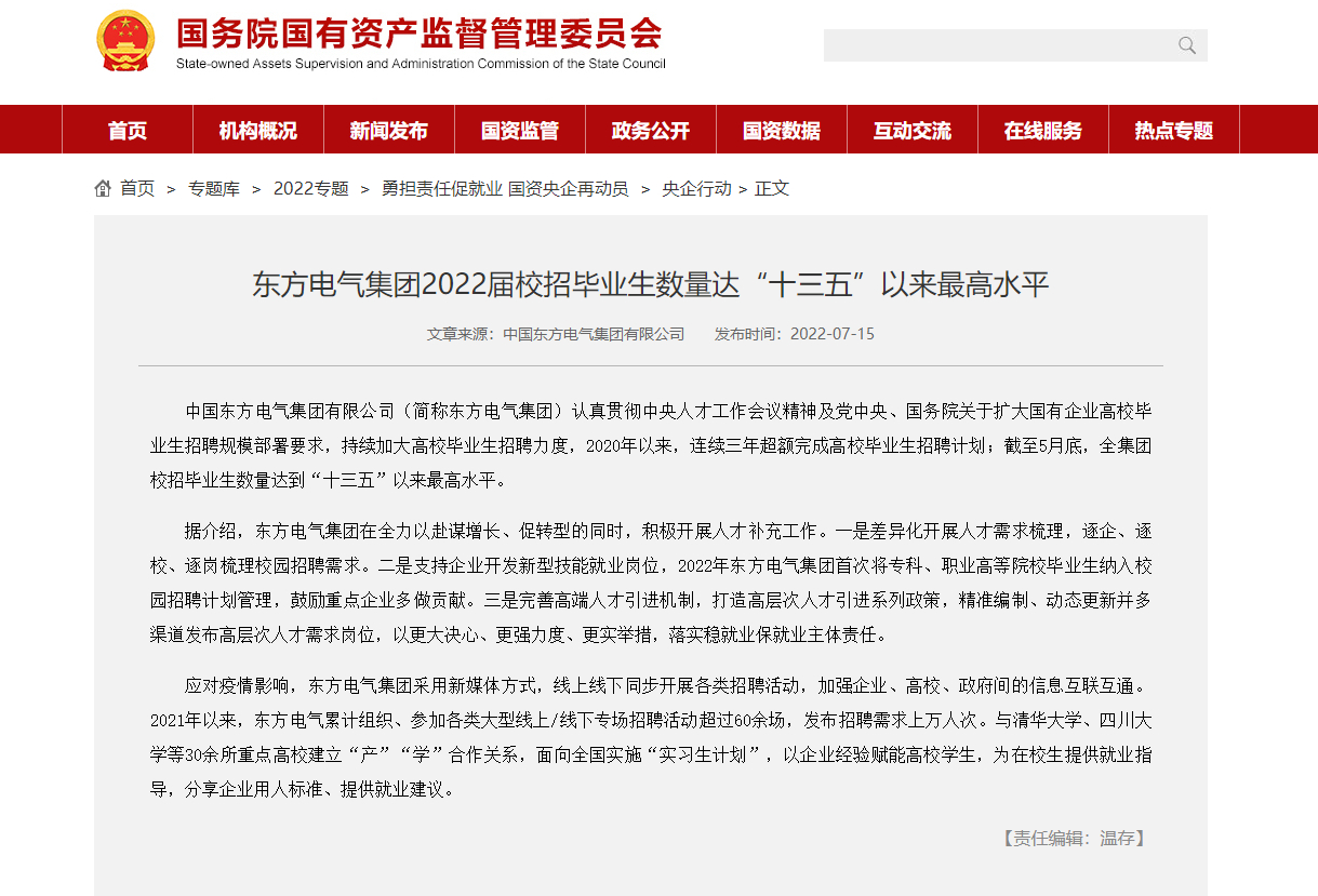 博鱼网页版(简称博鱼(中国))认真贯彻中央人才工作会议精神及党中央、国务院关于扩大国有企业高校毕业生招聘规模部署要求,持续加大高校毕业生招聘力度,2020年以来,连续三年超额完成高校毕业生招聘计划;截至5月底,全集团校招毕业生数量达到“十三五”以来最高水平。