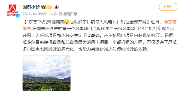 [国资小新]“东方”风机落地南美 厄瓜多尔目前最大风电项目机组全部并网