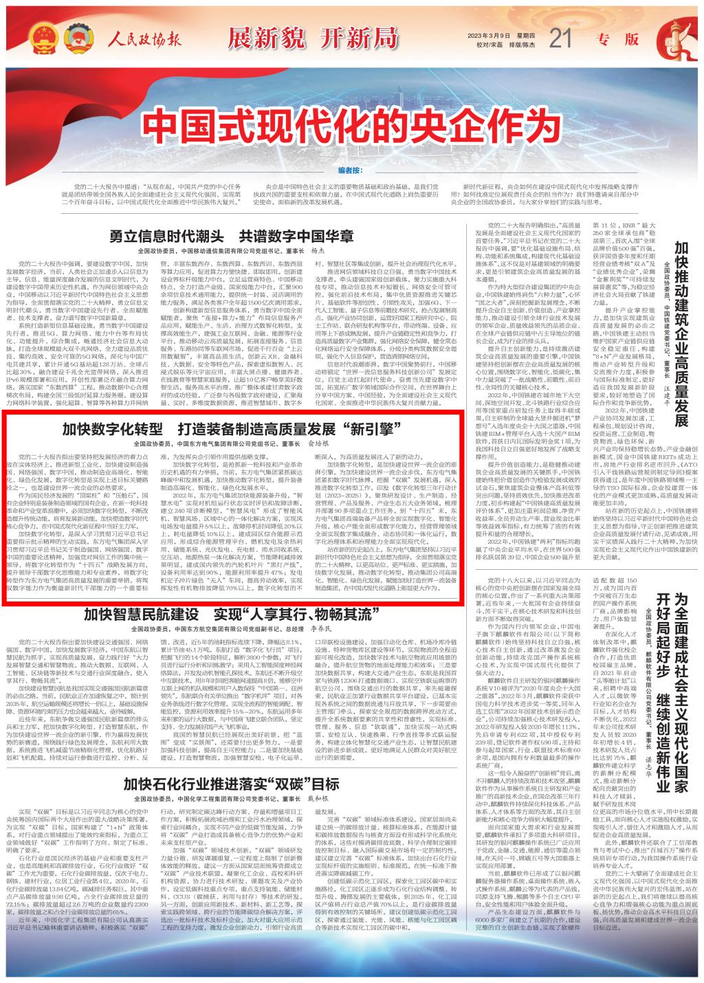 作为国民经济发展的“顶梁柱”和“压舱石”,国有企业特别是装备制造领域的国有企业,在新一轮科技革命和产业变革浪潮中,必须加快数字化转型,不断改造提升传统动能,培育发展新动能,加快塑造数字时代核心竞争力,在中国式现代化新征程中当好主力军。