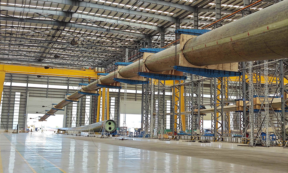 B1200A型叶片顺利通过静力试验、B1260A型叶片成功下线,有效验证了博鱼网页版风电叶片设计和制造技术水平,检验了企业自主开发超大型海上风电叶片的可靠性,将有力推动海上风电高质量发展和“双碳”目标实现。图为博鱼网页版B1200A型叶片静力试验现场。