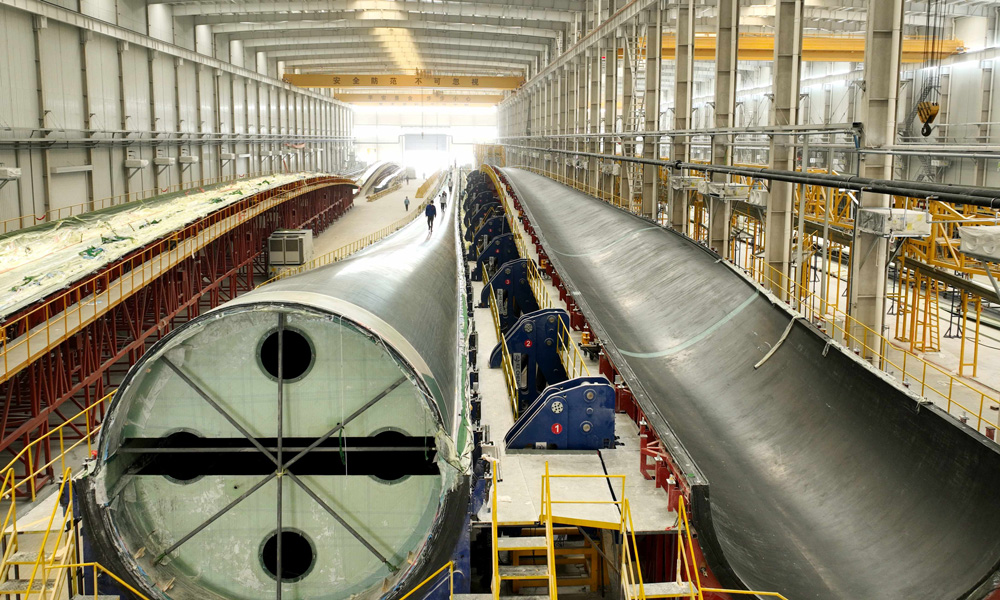 5月28日,博鱼网页版风电股份有限公司自主研制、拥有完全自主知识产权的B1260A型叶片,在江苏叶片制造基地顺利下线,该叶片长126米,是目前全球已下线的最长风电叶片。同日,东方风电自主研制的B1200A型叶片一次性顺利通过静力试验,各项测试指标与设计值良好吻合,120米级叶片的材料、结构、工艺及质量控制得到了充分有效验证。图为博鱼网页版B1260A型叶片下线现场。