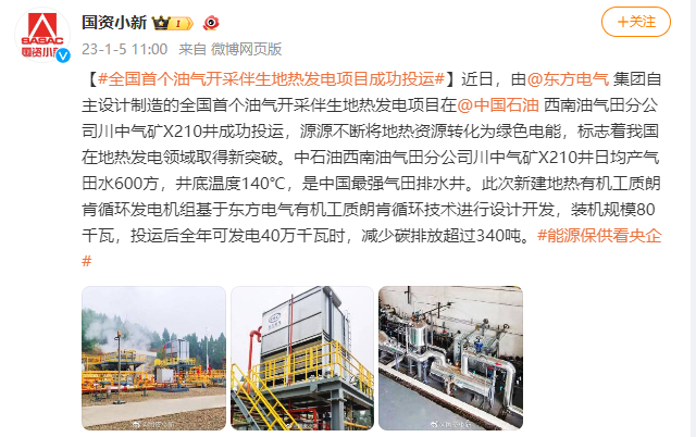 [国资小新]#全国首个油气开采伴生地热发电项目成功投运#