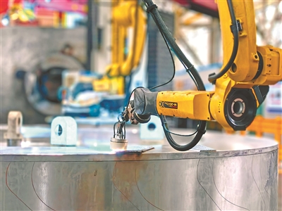 顺着一侧的步道往里走。在其中一个生产模块内,记者看到,3台机械臂正在对一个直径约5米、高约1米的大圆环上表面进行焊接作业。