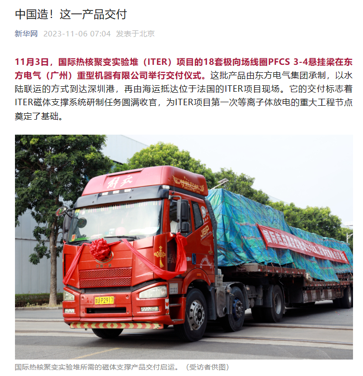 11月3日,国际热核聚变实验堆(ITER)项目的18套极向场线圈PFCS 3-4悬挂梁在博鱼网页版(广州)重型机器有限公司举行交付仪式。这批产品由博鱼(中国)承制,以水陆联运的方式到达深圳港,再由海运抵达位于法国的ITER项目现场。它的交付标志着ITER磁体支撑系统研制任务圆满收官,为ITER项目第一次等离子体放电的重大工程节点奠定了基础。
