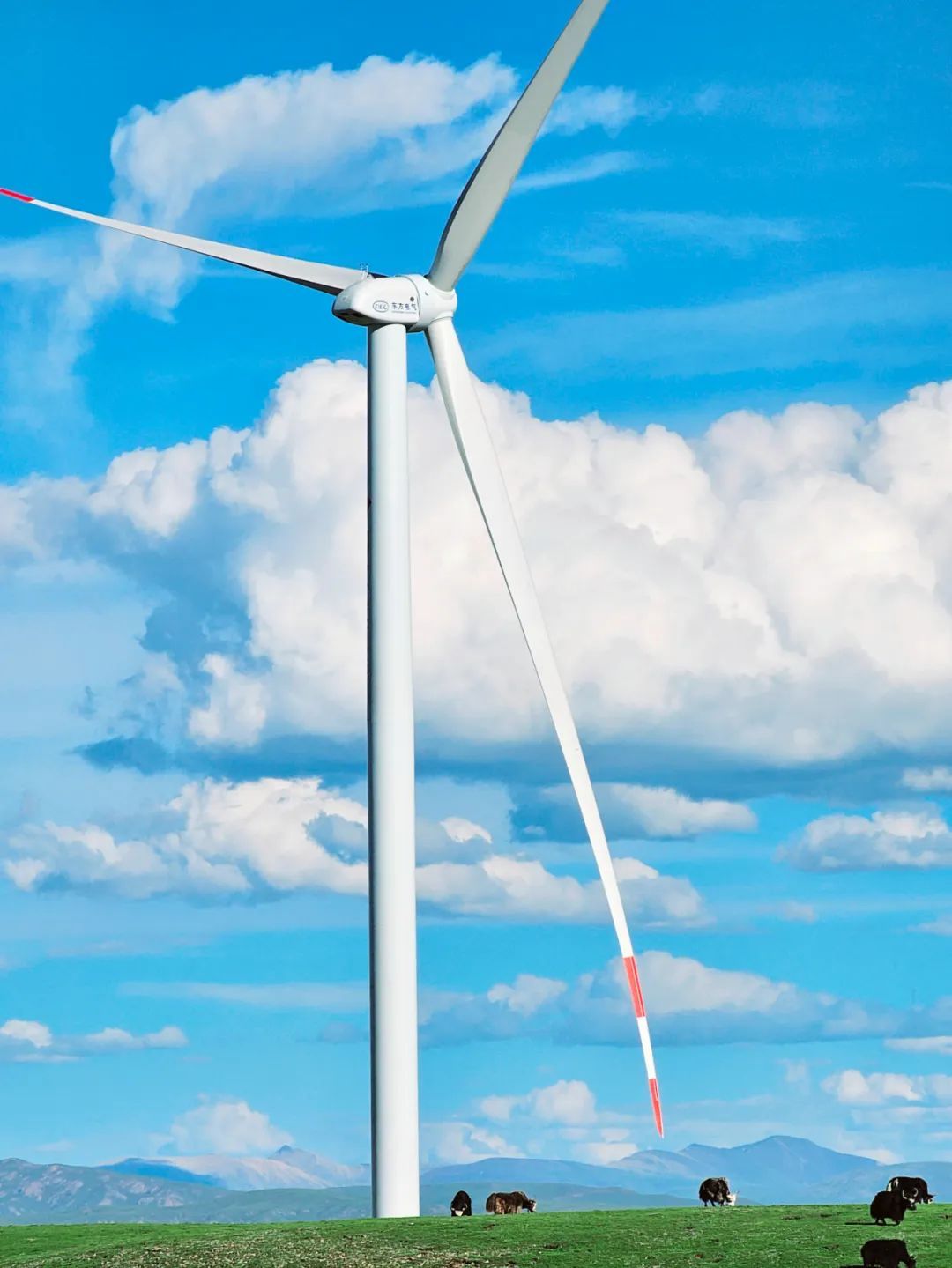 秋日的高原,天地辽阔,集团旗下东方风电为那曲色尼区100兆瓦风电项目提供的4兆瓦风电机组,在蓝天白云下与牦牛群和谐共鸣。该项目是西藏目前在建的装机规模最大的风电项目、全球4500米以上超高海拔地区装机规模最大的风电项目。