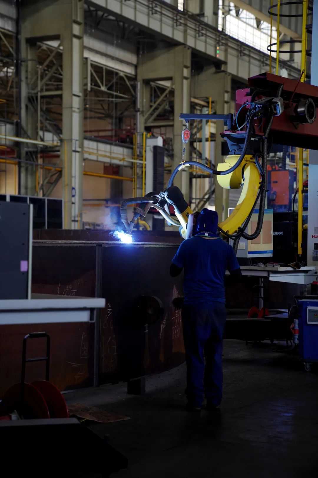 在生产制造现场,集团旗下东方电机一线职工正在操作智能焊接机器人进行玛尔挡水电项目机组部件堆焊。该项目是国家“西电东送”青豫直流配套骨干电源点之一,是青海省打造的“水光储蓄”千万千瓦级多能互补一体化全清洁能源大基地的核心工程,是黄河上游在建海拔最高、装机容量最大的水电站。