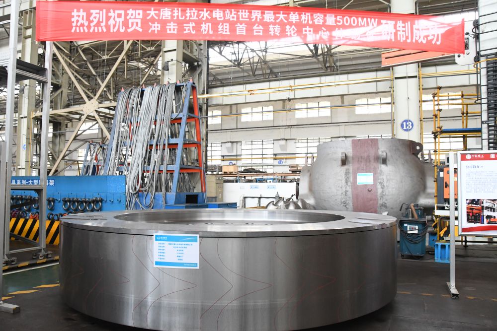 据介绍,500兆瓦冲击式水电机组入选国家能源局2021年度能源领域首台(套)重大技术装备(项目)名单。超高水头的冲击载荷,考验着转轮的刚度强度、动力特性、动应力控制等。作为转轮的主体结构,超厚不锈钢中心体锻件难以制造,卡住了机组研制的咽喉。