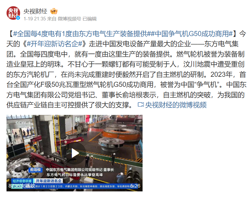 【#全国每4度电有1度由博鱼网页版生产装备提供##中国争气机G50成功商用#】今天的《#开年迎新访名企#》走进中国发电设备产量最大的企业——博鱼(中国)。全国每四度电中,就有一度由这里生产的装备提供。燃气轮机被誉为装备制造业皇冠上的明珠。不甘心于一颗螺钉都有可能受制于人,汶川地震中遭受重创的东方汽轮机厂,在尚未完成重建时便毅然开启了自主燃机的研制。2023年,首台全国产化F级50兆瓦重型燃气轮机G50成功商用,被誉为中国“争气机”。博鱼网页版党组书记、董事长俞培根表示,自主燃机的突破,为我国的供应链产业链自主可控提供了很大的支撑。