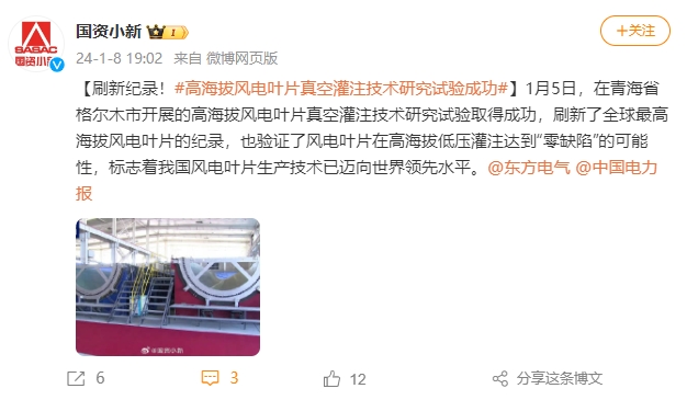【刷新纪录!#高海拔风电叶片真空灌注技术研究试验成功#】1月5日,在青海省格尔木市开展的高海拔风电叶片真空灌注技术研究试验取得成功,刷新了全球最高海拔风电叶片的纪录,也验证了风电叶片在高海拔低压灌注达到“零缺陷”的可能性,标志着我国风电叶片生产技术已迈向世界领先水平。@博鱼网页版@中国电力报