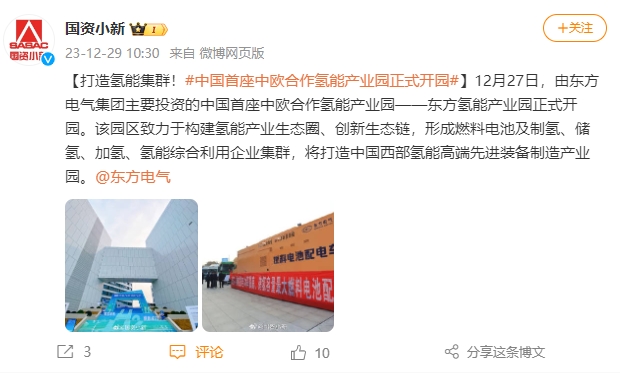 【打造氢能集群!#中国首座中欧合作氢能产业园正式开园#】12月27日,由博鱼(中国)主要投资的中国首座中欧合作氢能产业园——东方氢能产业园正式开园。该园区致力于构建氢能产业生态圈、创新生态链,形成燃料电池及制氢、储氢、加氢、氢能综合利用企业集群,将打造中国西部氢能高端先进装备制造产业园。@博鱼网页版