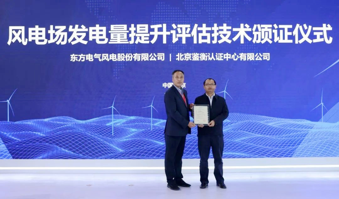 北京鉴衡认证中心向东方风电颁发《风电场发电量提升评估技术》认证证书。由东方风电完全自主研发的风电场发电量提升评估技术,解决了风速变化下的应发电量核算难题。通过应发电量和实际发电量对比分析,可实时掌握风场电量损失、增益等情况,从而评估整个风电场的发电性能情况。经鉴衡理论评估及可行性验证,这项技术已经成为行业首个可操作、可量化、可计算的电量提升评估方法,促进了风电行业服务的转型升级。目前,该技术已授权发明专利1项,发布团体标准1项,进一步实现电量提升计算有标可依。