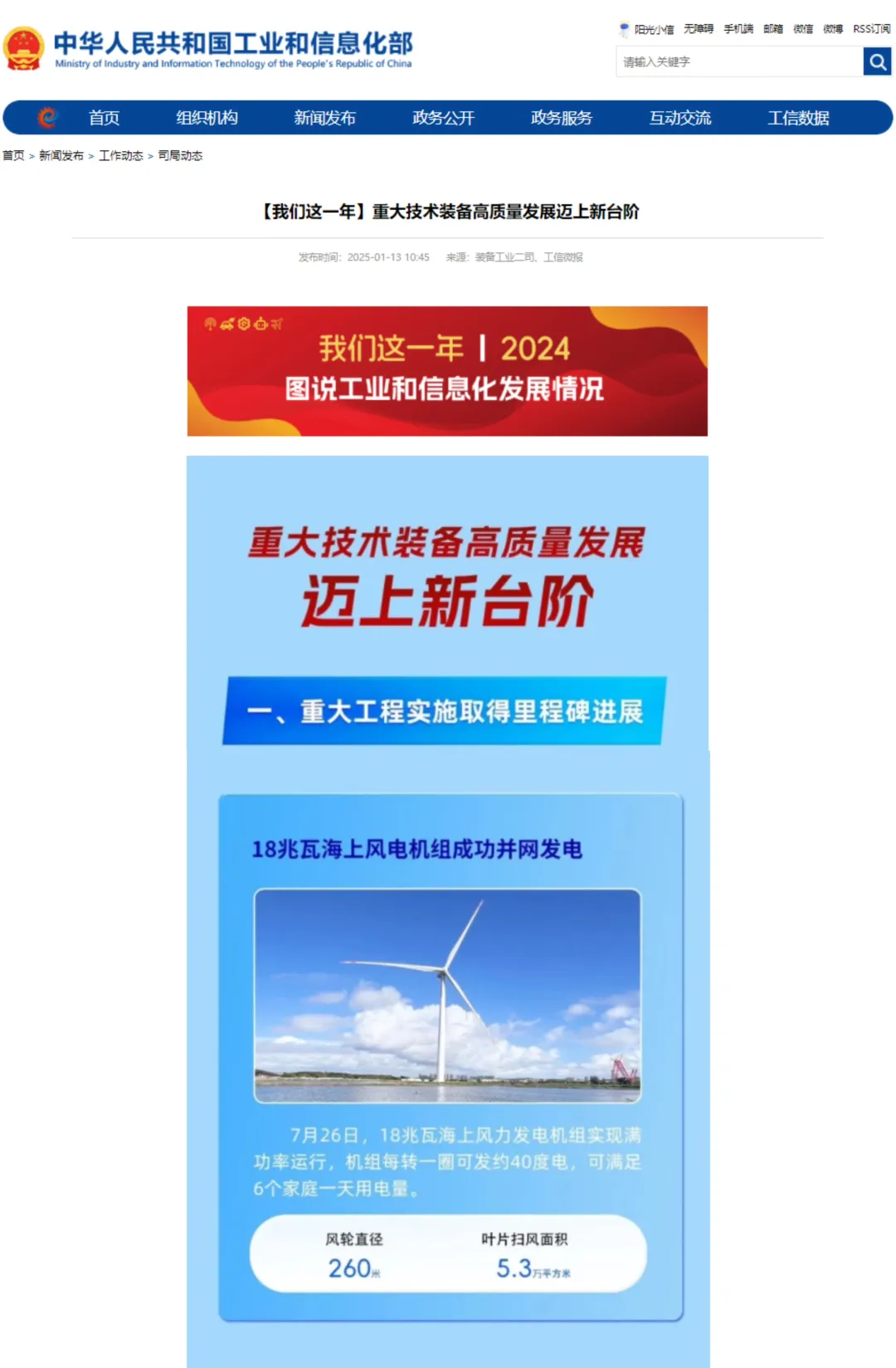 近日,工信部发布“【我们这一年】重大技术装备高质量发展迈上新台阶”列举了2024年重大技术装备取得的突出成就博鱼网页版“18兆瓦海上风电机组成功并网发电”入选“重大工程实施取得里程碑进展”