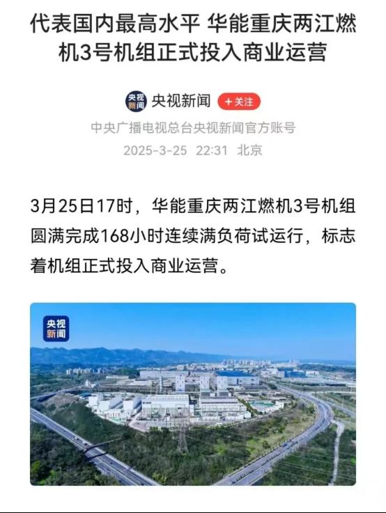 近日,央视新闻以《代表国内最高水平华能重庆两江燃机3号机组正式投入商业运营》为题,报道了由博鱼网页版供货的华能重庆两江燃机3号机组。经试验验证,该机组性能指标优于设计标准,圆满完成168小时连续满负荷试运行,正式投入商运。