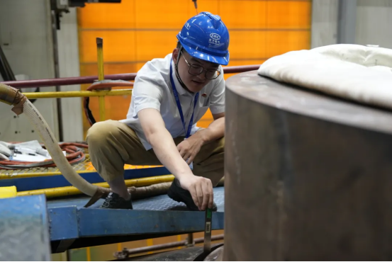 随着“嗞”的电流声响起,焊枪缓缓移动,生产制造部焊接骨干刘庆眉头逐渐紧锁,高度紧张,眼神紧盯焊点,手握机械臂操控柄,挪着小碎步精细操作,完全顾不上自己踩在超150℃高温的十米高的操作台上。