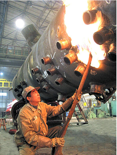 2005年,钟家权光荣退休了,但是,挚爱东锅的钟家权,在公司、车间领导和职工的关心支持下,又拿起了焊枪,与昔日的伙伴们一起奋战在核电工段,参与了广东岭澳核电站二期1000MW核岛主设备制造。经过1年时间的艰苦奋斗,2006年8月份,顺利完成3台安注箱的焊接任务;2006年10月初,要求高、工作条件最为艰苦的1台硼注射器焊接难关又被攻克了,为东方锅炉按期履行合同做出了新的贡献。在安注箱启运前的那一刻,钟家权让记者拍照留下了这一令他一辈子自豪而又难忘的瞬间……