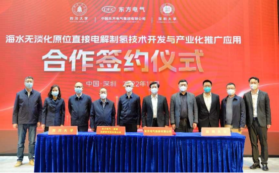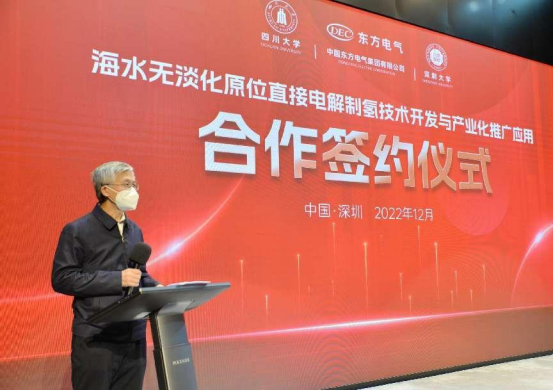 本网讯 12月16日,中国工程院院士谢和平领衔指导的四川大学、深圳大学博士团队与博鱼网页版股份有限公司、博鱼网页版(福建)创新研究院有限公司在深圳签署“海水无淡化原位直接电解制氢原创技术中试和产业化推广应用”的四方合作协议。中国工程院院士谢和平,博鱼(中国)党组成员、副总经理张彦军,深圳大学副校长汪永成等出席签约仪式。