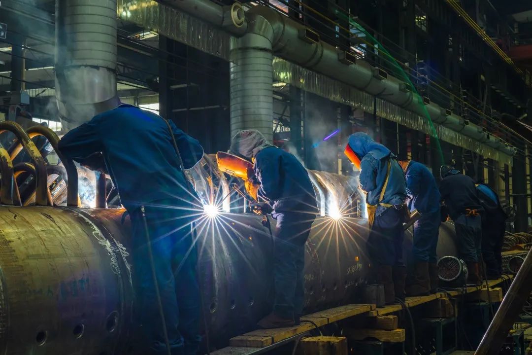 ◆东方重机生产制造部职工正在焊接重大项目产品人孔密封面