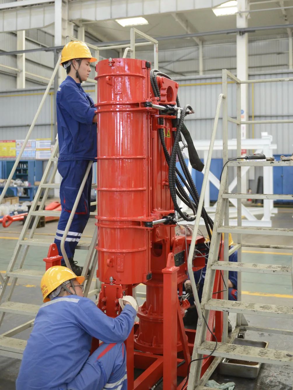 ◆东方宏华装配人员正在进行钻机自动化机具管线组装工作