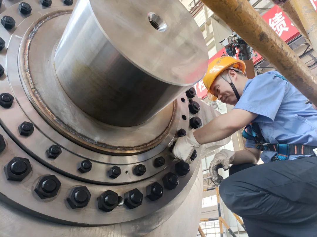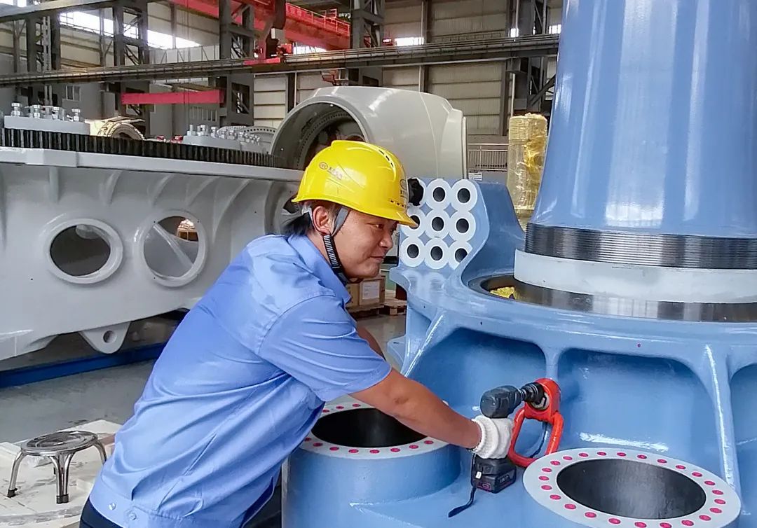 ◆东方电机水轮机分厂内,蟠龙3号机球阀轴端正在进行装配作业