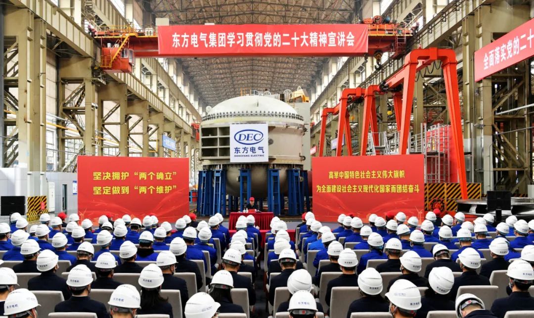 俞培根要求,对党的二十大报告和党章作出的关于国资国企改革发展和党的建设的重大部署,要认真研究、深入思考、系统把握、深化落实。他从“七个深刻把握”对全集团结合实际深入贯彻落实党的二十大精神作出系统安排,特别是对东方电机在加快建设世界一流企业、提升科技创新支撑作用、加快绿色低碳转型发展、释放企业改革活力动力、以高质量党建引领保障高质量发展等方面提出明确要求。