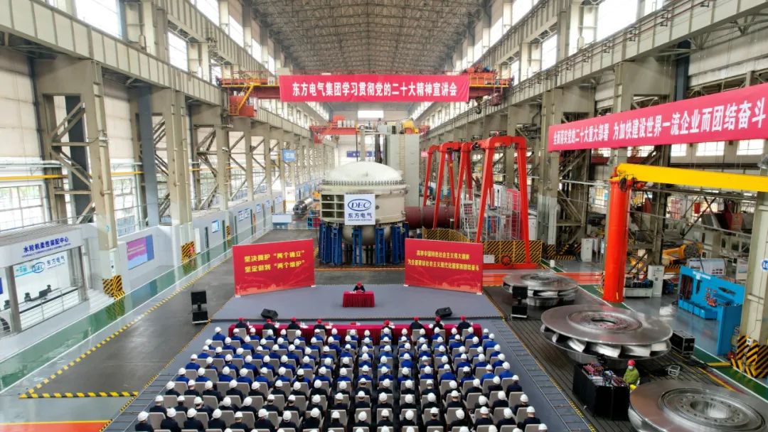 11月10日,四川德阳天朗气清,博鱼(中国)所属东方电机的大型清洁能源装备重型制造数字化车间巨型部件错落有致,坦桑尼亚朱利诺水电项目巨型蝶阀展现“重器”力量,这是博鱼(中国)学习贯彻党的二十大精神首场宣讲会现场。当天,党的二十大代表,博鱼(中国)党组书记、董事长俞培根在车间一线宣讲党的二十大精神。