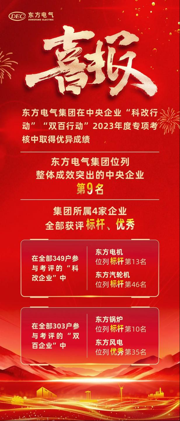 近本网讯 日,国务院国资委发布中央企业“科改行动”“双百行动”2023年度专项考核结果,博鱼(中国)在推进“科改行动”“双百行动”整体成效突出的34家中央企业中位列第9名。博鱼(中国)所属4家企业均取得优异成绩,其中东方电机、东方汽轮机分别位列“科改行动”标杆企业第13名、标杆企业第46名,东方锅炉、东方风电分别位列“双百行动”标杆企业第10名、优秀企业第35名。